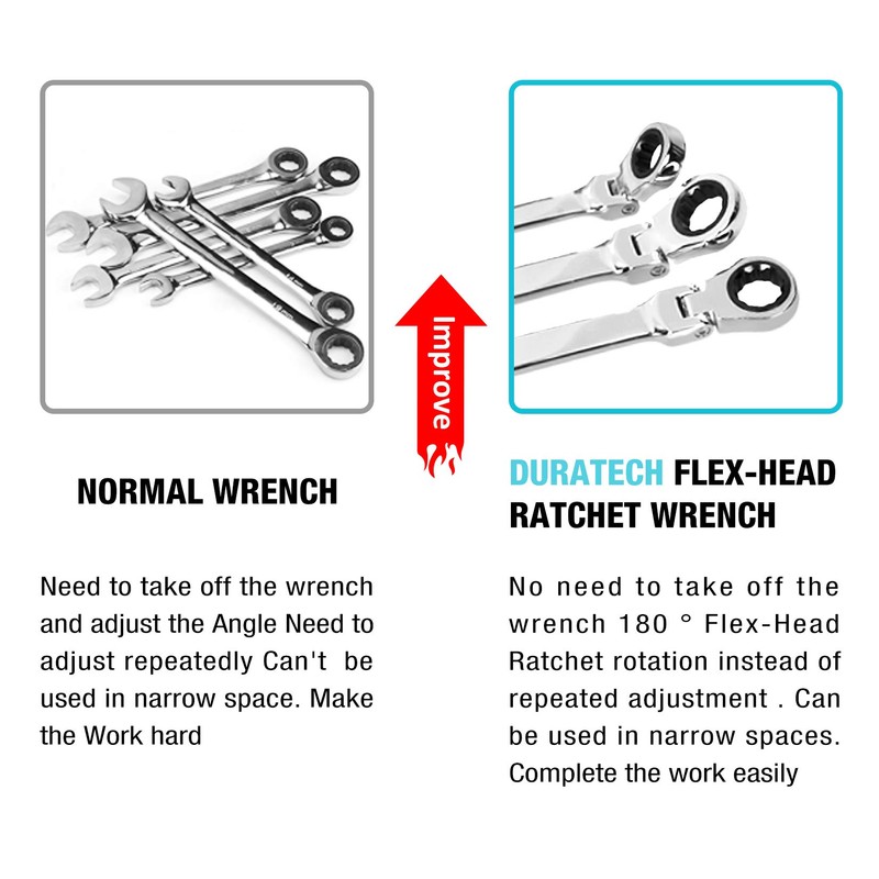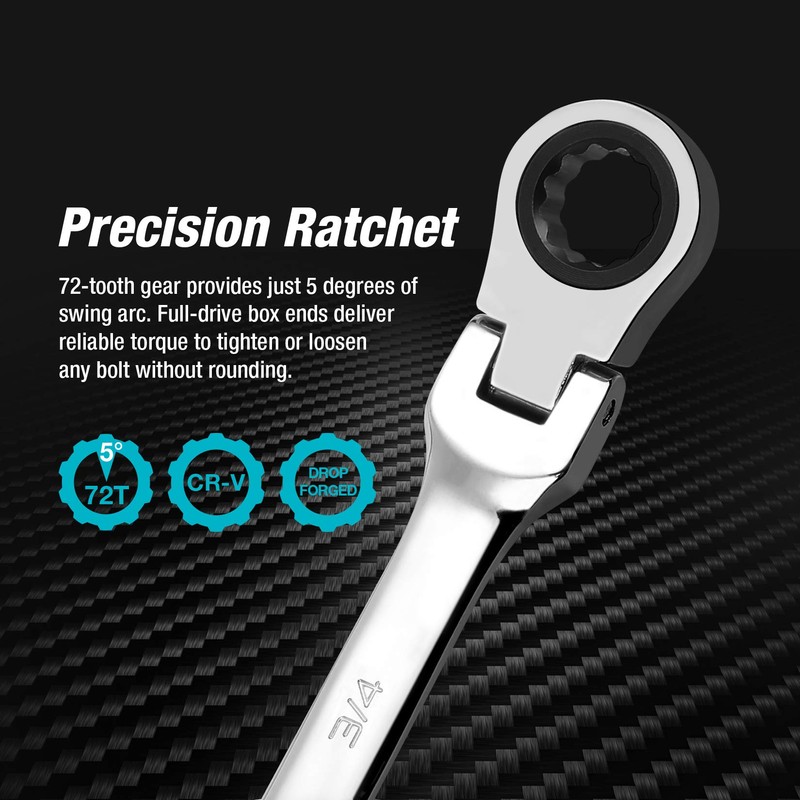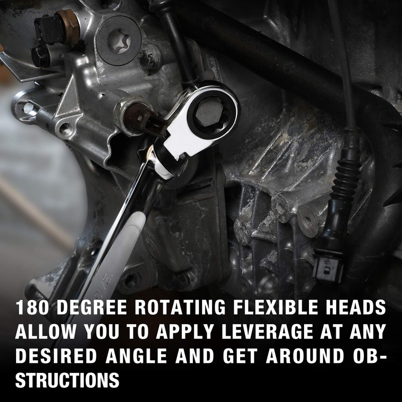 - 72-tooth ratchet gear needs a minimum of 5 degree swing arc that is perfect for restricted, hard to reach work spaces 180 degree rotating flexible heads allow you to apply leverage at any desired angle and get around obstructions great for tight spaces design.