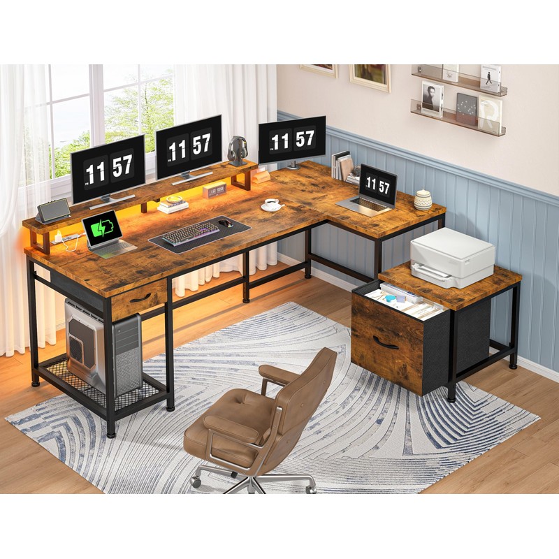 DurayLoly L Shaped Desk with Drawers & Printer Storage Shelves for Home Office, Large Reversible Computer Desk with LED Lights & Power Outlets, Office Desk with Monitor Shelf, Rustic Brown