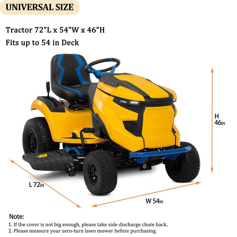 - Taño de ajupatible: 72 pulgadas de largo x 54 pulgadas de ancho x 46 pulgadas de alto espatible con la mayoría de marcas de cortacésped. como John Deere, Husqvar, Troy Bilt, Toro, Honda y Cub Cadet. Nota: confirma el taño de tu cortadora antes de realizar el pedido.