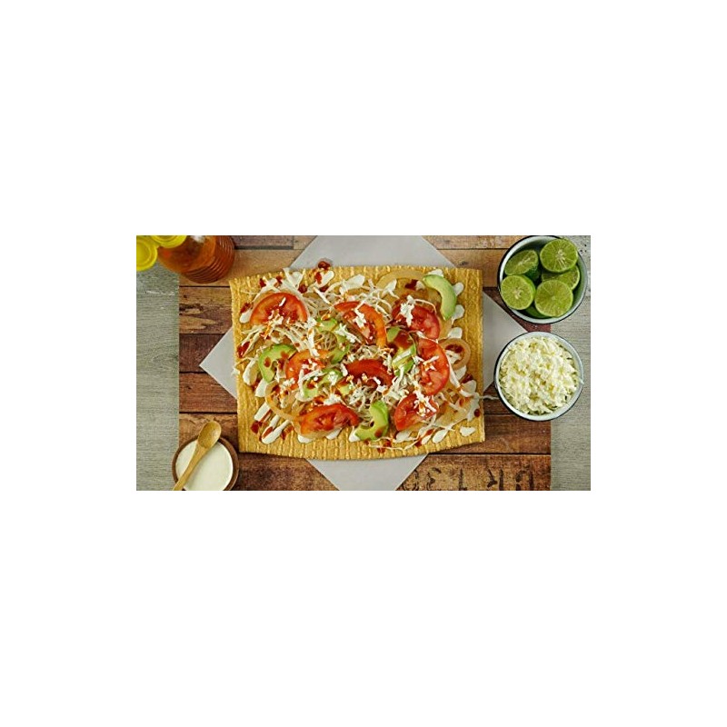 Harina de trigo, en forma de lámina rectangular estriada. Cuando el producto se frie en aceite, mide en promedio 28x16 cm. Wheat flour, in the form of fluted rectangular sheet. When the product is fried in oil, it measures 28x16 cm on average.