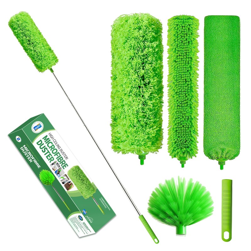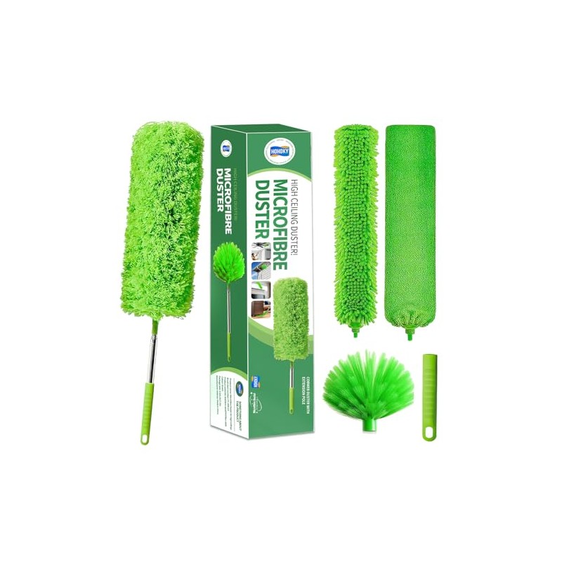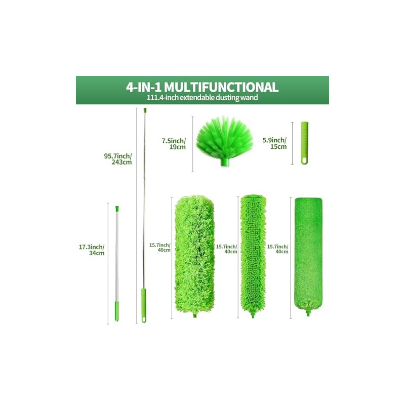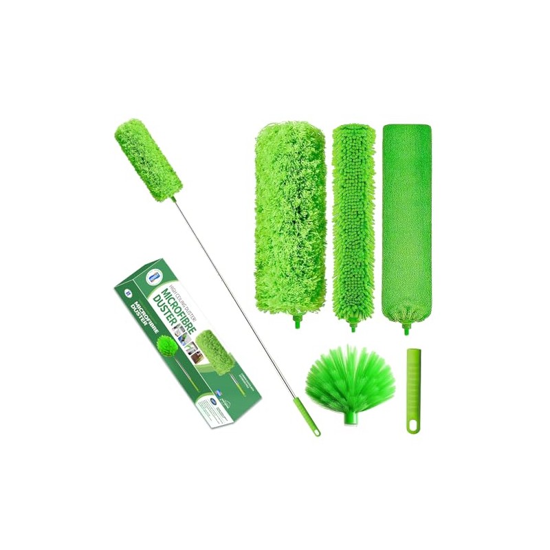 - 7-Ppiece Set: The high duster kit includes a spider web duster x 1; ultra-fine fiber duster x 1; stainless steel telescopic pole x 1; gap cleaning head x 1; chenille cleaning brush x 1; replacement short handle x 1; storage net bag x 1. The feather duster set is perfect for cleaning furniture, ceilings, ceiling fans, stairs, window sills, and spider webs.dusters for cleaning