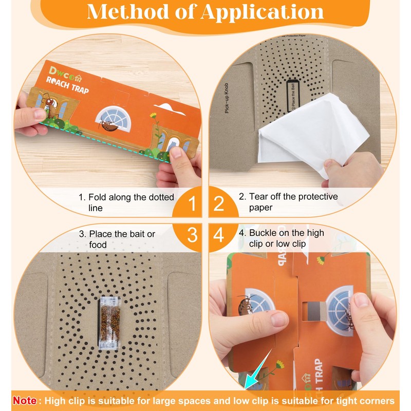 - [Dual-Buckle & Multi-scene to Set]: Cockroach killer indoor home are designed with dual buckle and multiple entrances, allowing to adjust the height of the cockroach entrances to suit the situation. Roach killer indoor infestation's high buckle is suitable for placing in corner of wall, under the water pipe, under the bed or other wide positions. Roach motel 's low buckle is more suitable for a more narrow position like under the refrigerator or under the cabinet.