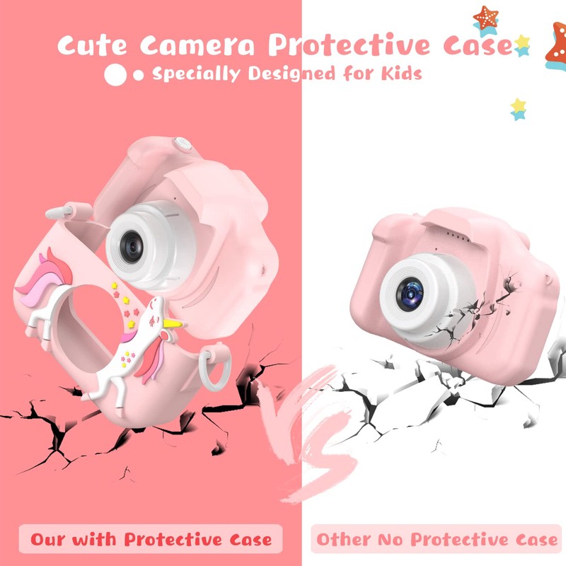 - 【Specially Upgraded Design for Children】Upgraded to dual-camera configuration, Easy to take selfies. Just open the switch key to enjoy the fun of taking photos. The cute cartoon silicone casing provides the kids camera with nti-drop design, allows kids to enjoy happy and freedom photography moments without worries of broken. The camera for kids also specially designed a durable lanyard for portability, children can hang the camera on their neck.