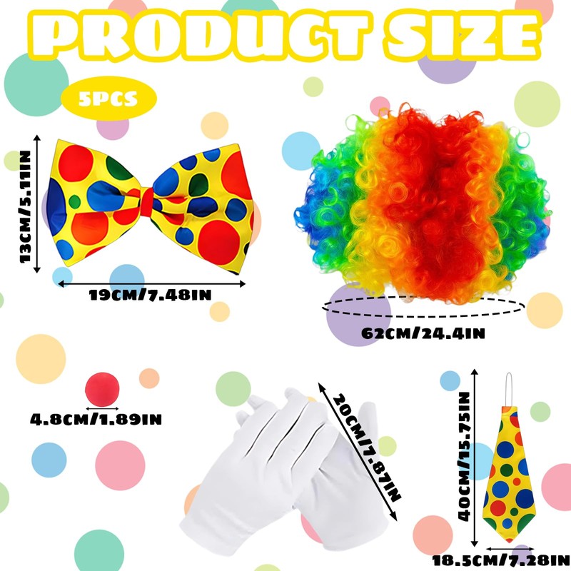 - Complete 5-Piece Clown Costume Set: Includes everything you need for a full clown transformation – colorful wig, red clown nose, jester hat, gloves, and matching accessories. Vibrant multi-colored design perfect for circus costumes or killer clown looks.