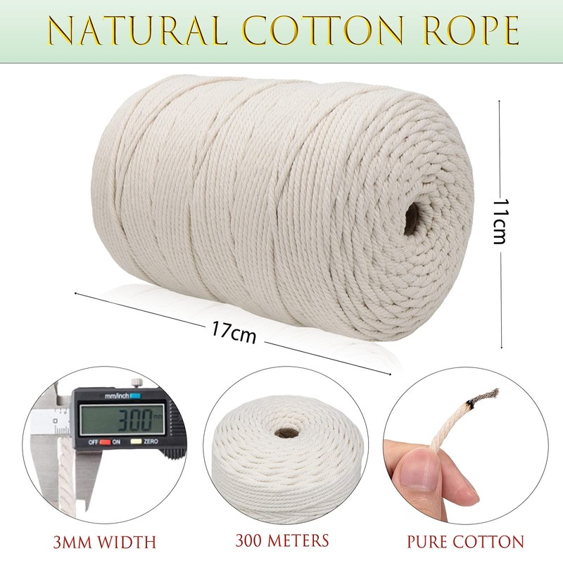 - Size: the length of 300 m, a 3 mm cotton yarn made of 4 strands of macrame cord has a stronger toughness and better durability. Creative DIY wall decoration macrame yarn is very long, cotton cord is soft and durable. Macrame yarn packed in the shape of a spool, the cotton cord does not entangle and you can cut macrame to any length.