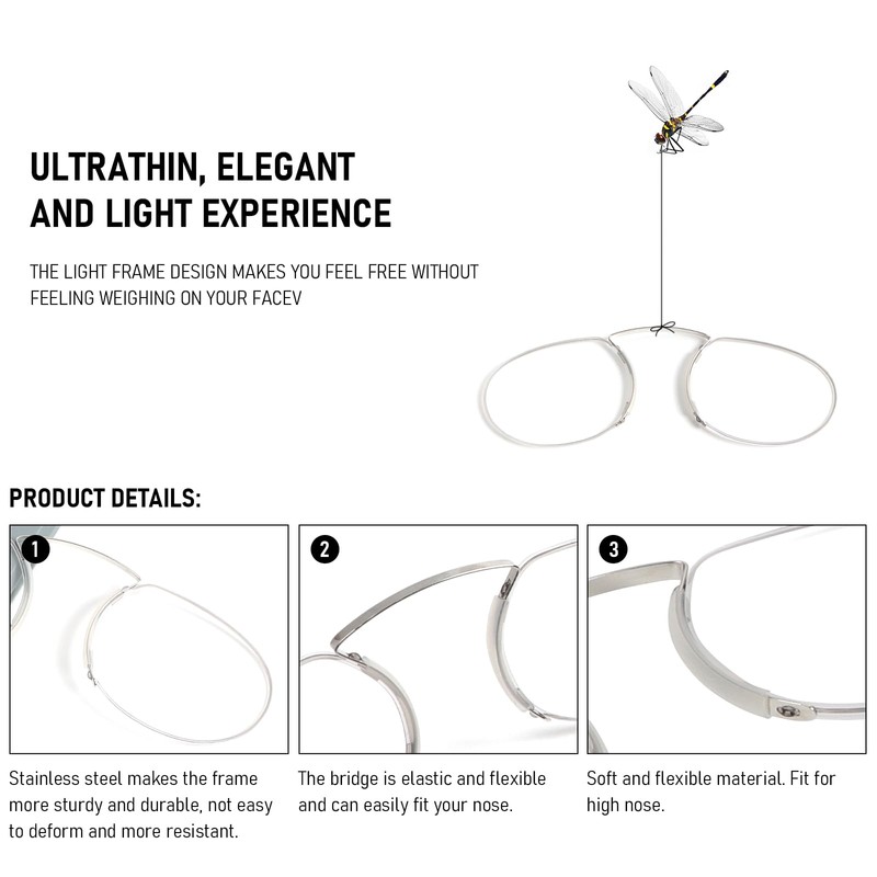 - Flexible Nose Bridge: The bridge has a high elesticity which can adjust to suitable for you. These clip on nose eyeglasses are more suitable for high nose.