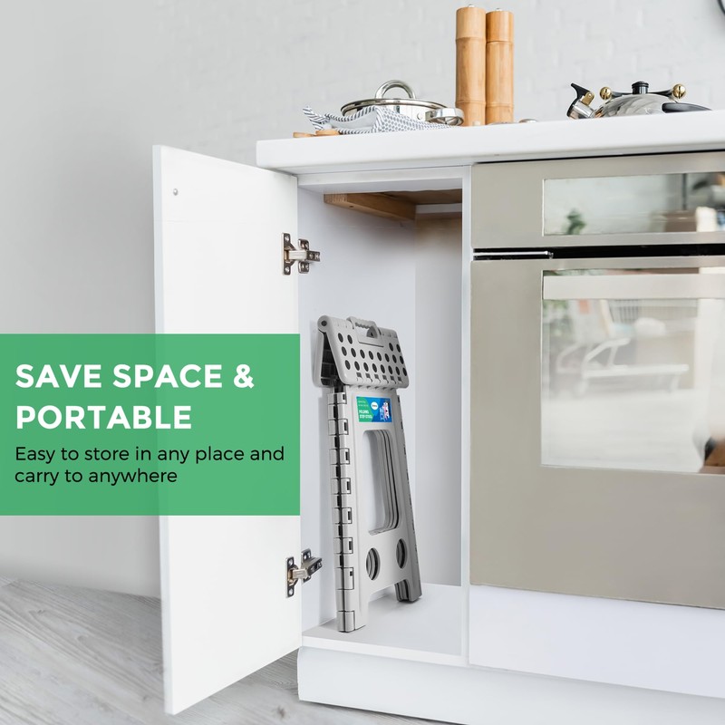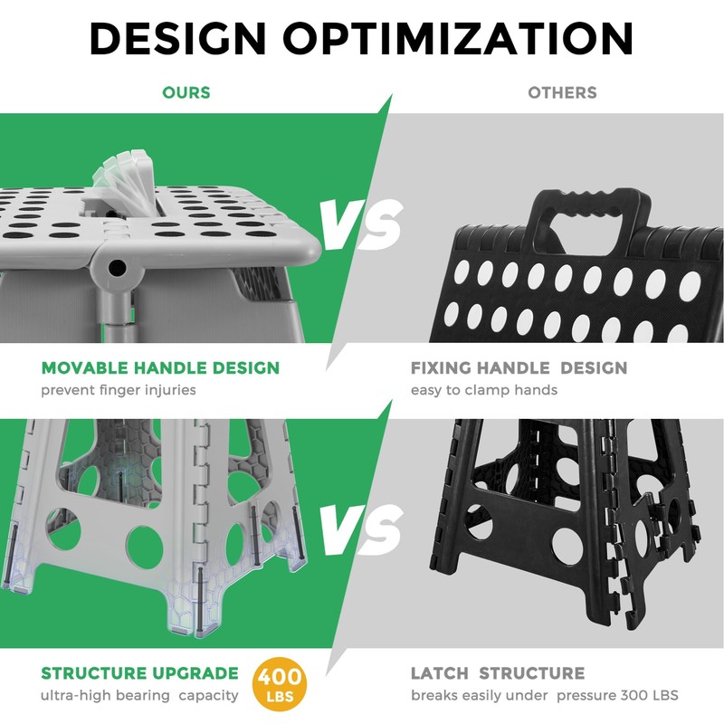 - 【Lightweight & Portable】Easy to carry around, this foldable step stool can be used across rooms or taken outdoors. Its compact design fits into any storage space, even your car for those camping trips. Upgrade your portability with Solid Strength.