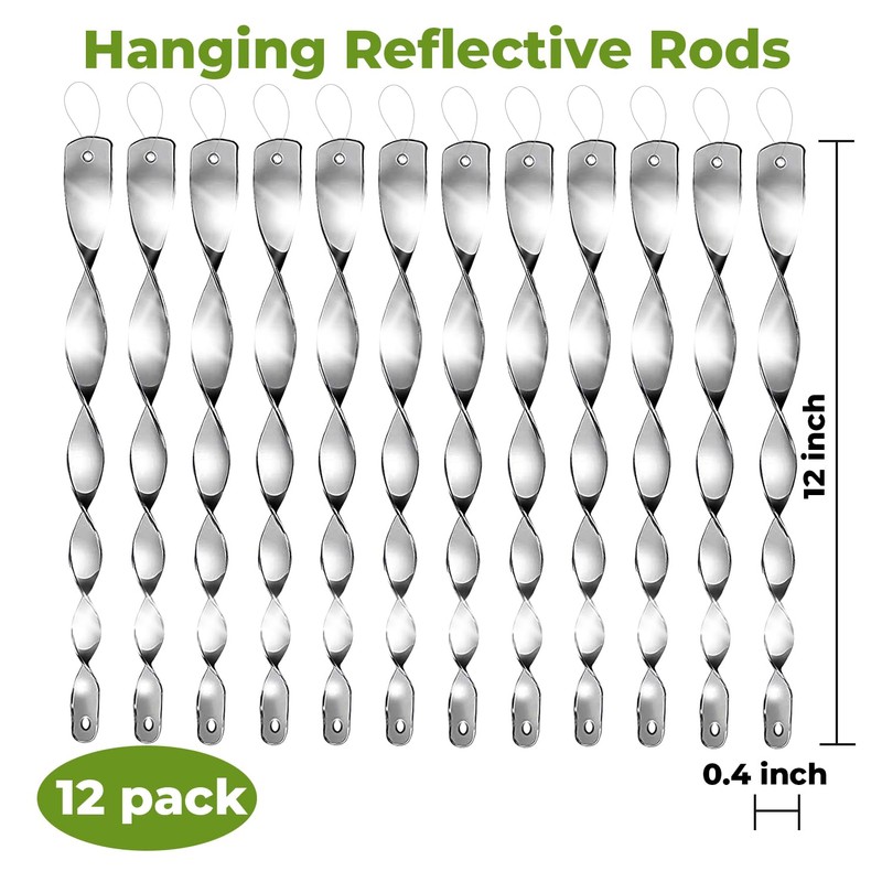 - Protect Assets - Our 12 inch reflective scare rods spin in the breeze and create strong reflections. Protect assets to minimize losses. Use for house, windows, cars, backyard, patio, garden, balcony, fruit trees automobiles and equipment.
