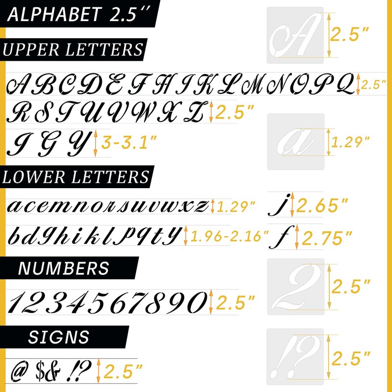 • 【Package Includes】: You will receive 65 pieces painting stencils totally, including 26 uppercase letters, 10 numbers, 26 lowercase letters, 4 styles symbol stencils. These will give you endless possibilities of customized words to create any DIY art projects as you like. More than that, all the characters have a stylish, calligraphic, cursive, and very pleasant font. (Font size: 2.5 inch).