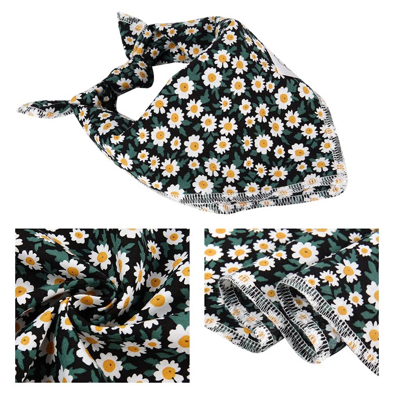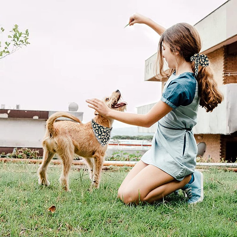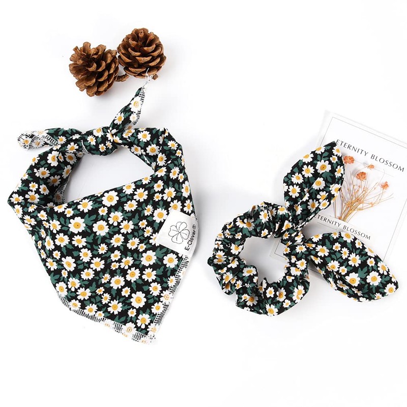 - Matching Bandana and Scrunchie Set - It’s full of love when your pets is wearing the black flower bandanas and you are wearing the bow scrunchies. When traveling, sleeping, taking photos or daily walking, adorable spring doggie bandana and floral scrunchie is a pretty accessories. The scrunchie can be worn as a wrist accessory and hold your hair. Beautiful dog drool bib and scrunchie with white floral and geen leafs pattern, it’s nice photo props.