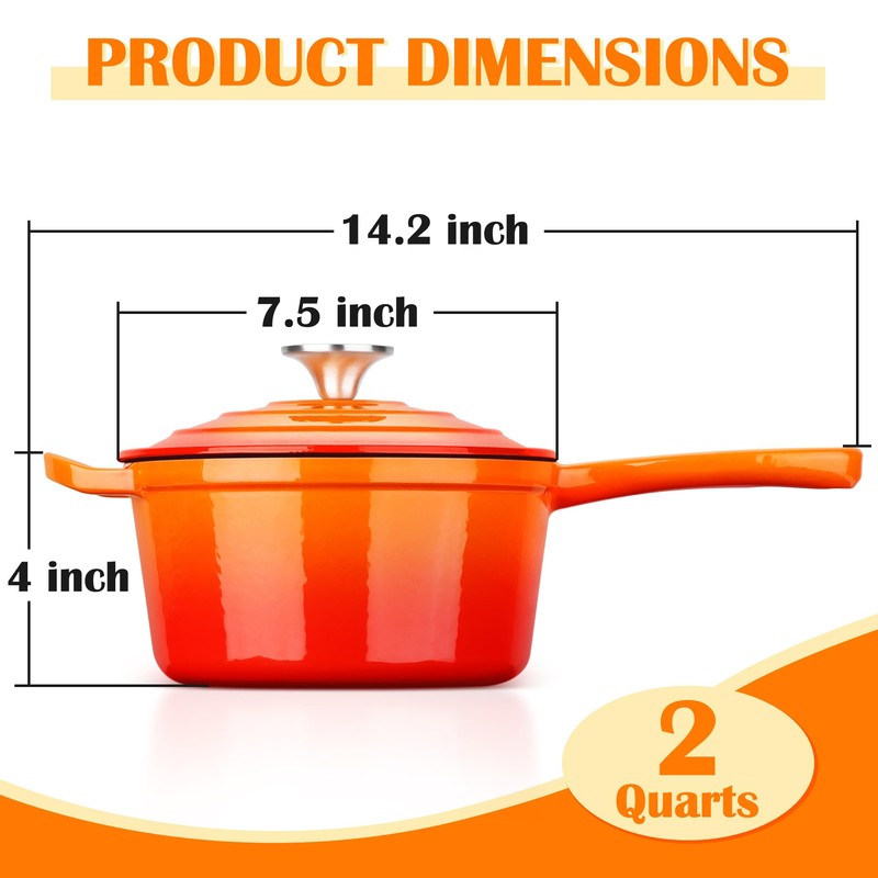 E-far Enameled Cast Iron Sauce Pan, 2 Quart Dutch Oven Saucepan with Lid, Small Sauce Pot for Cooking, Boiling, Healthy & Non Toxic, Induction & Oven Safe, Orange