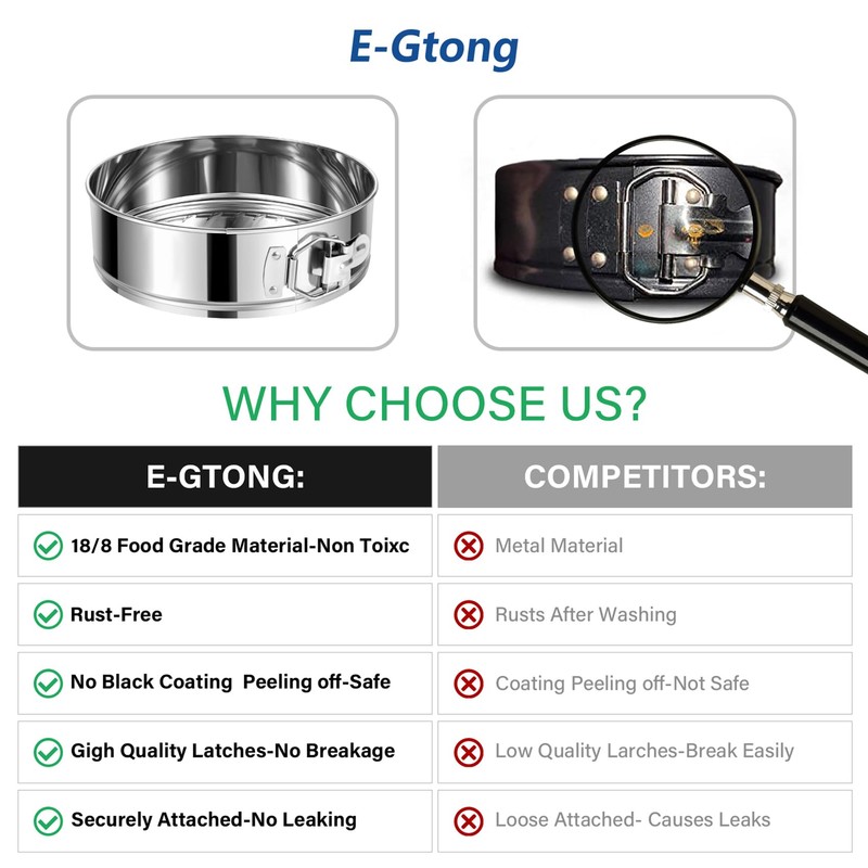 - Material última intervensión de toxinas y seguro: el juego de moldes E-Gtong está hecho de acero inoxidable 304 de alta calidad, fuerte y duradero, material sustancial, última intervensión de BPA, resistente al calor. Mucho más fácil de limpiar este molde para hornear pasteles.