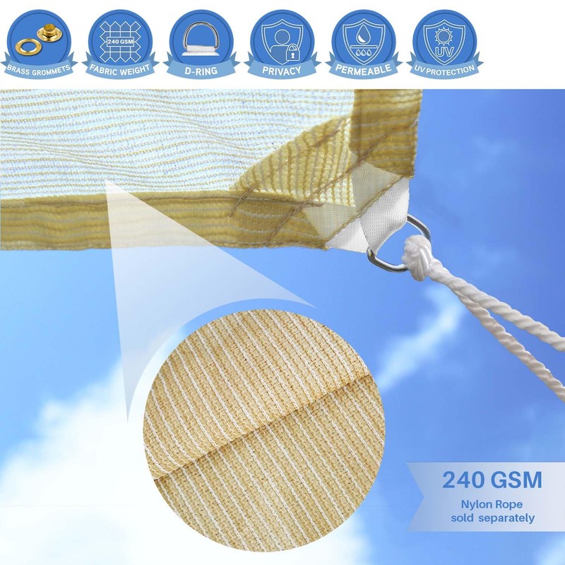 - HIGH QUALITY MATERIAL - Our sun shade sail is made of 240GSM high-density polyethylene fabric, finished with the strong stitching seam and double-layer webbing. It is durable and not easy to fade, but not waterproof.