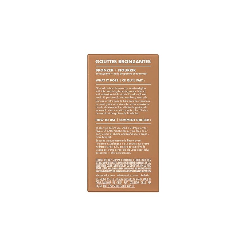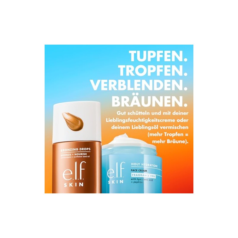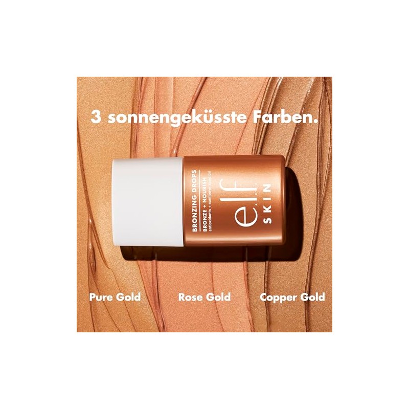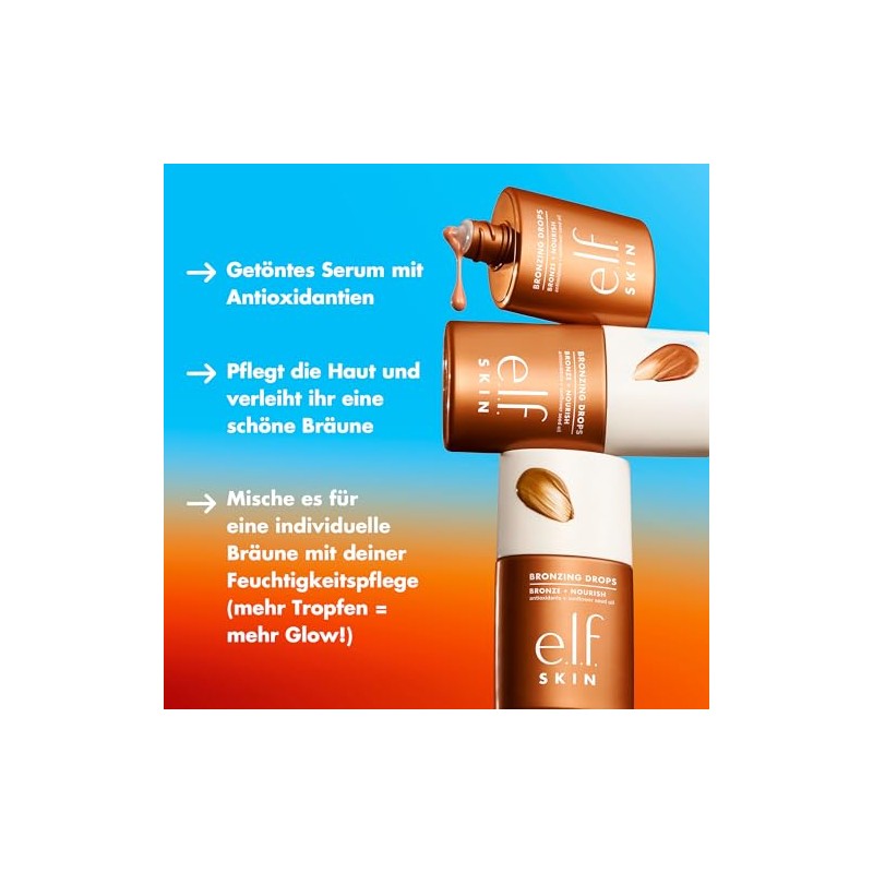 - RUNDUMGLANZ: Entdecke die hei?esten e.l.f. SKIN Bronzing Drops. Das Bronzing-Serum verleiht dir einen warmen, sonnengekssten Teint ganz ohne Sonne! Tipp: Je mehr Drops, desto intensiver der Glow.