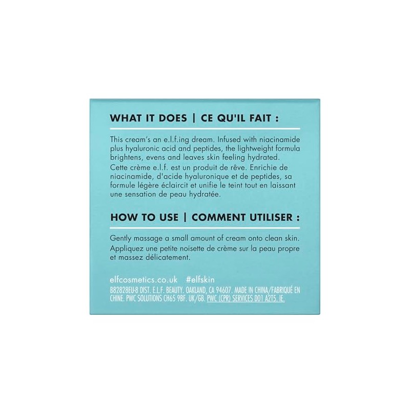 ProduktbeschreibungWas ist das? Eine leichte, feuchtigkeitsspendende Gesichtscreme, die die Haut n?hrt und ihr Feuchtigkeit spendet.Warum du es lieben wirst:Spendet Feuchtigkeit fr geschmeidige HautZieht mhelos in die Haut einFrischer, sauberer DuftWichtige Inhaltsstoffe:Hyalurons?ureNiacinamidSqualanPeptideVitamin B5Ideal fr: Normale, fettige, kombinierte und besonders trockene HautDiese Gesichtscreme liefert einen kr?ftigen Feuchtigkeitsschub und l?sst die Haut strahlen. Diese Creme eignet sich fr normale, fettige, Mischhaut und besonders trockene Haut. Sie ist vollgepackt mit n?hrenden und feuchtigkeitsspendenden Inhaltsstoffen, die den Teint mit Feuchtigkeit versorgen und ihn prall erscheinen lassen. Die nicht fettende Creme ist ideal fr die morgendliche und abendliche Anwendung und zieht schnell in die Haut ein, sodass sie sich geschmeidig anfhlt.Alle e.l.f. Produkte sind stolz 100 % vegan und tierversuchsfrei und von Leaping Bunny zertifiziert. Weil kindness chic ist.WarnhinweiseFor external use only.