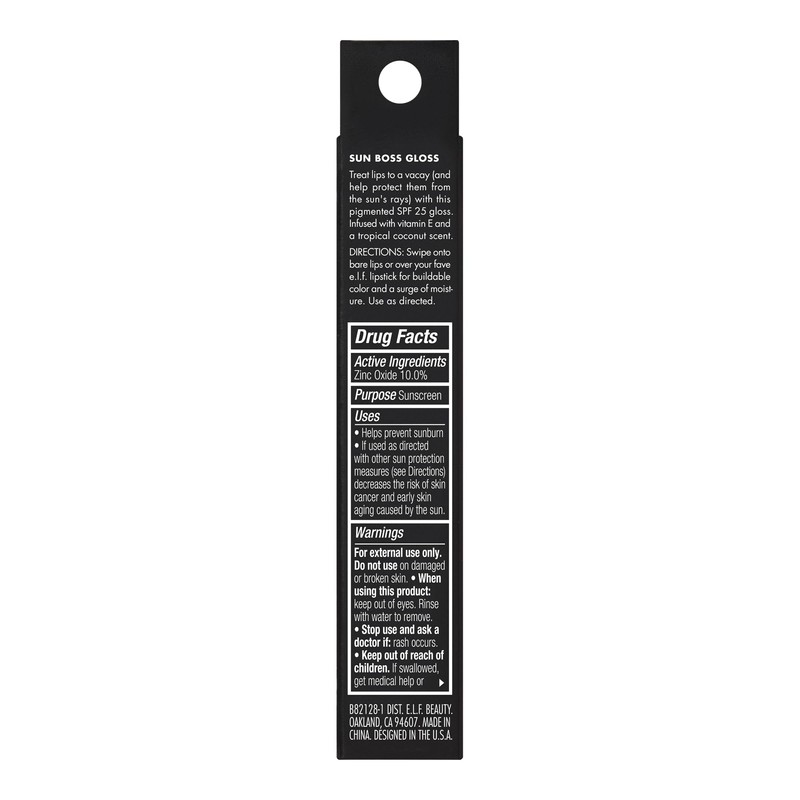 SPF like a gloss with e.l.f. Cosmetics Sun Boss Gloss! This lip-enhancing tinted lip gloss delivers mineral SPF 25 sun protection, buildable color and a high-shine finish. The moisturizing formula is infused with conditioning vitamin E and hyaluronic acid, plus a delish coconut scent that treats lips to a tropical vacay.What it is:Pigmented lip gloss delivers mineral SPF 25 protectionBuildable color with a high-shine finishInfused with Vitamin E to help moisturize and condition lipsAddictive tropical coconut scentKey Ingredients:Zinc oxideVitamin EShade Descriptions:Peachy Kween – Soft CoralIt's Your Mauve – Neutral MauvePink-me Girl – Pink BeigeBlush Much? – Milky PinkThat's My Jam – BerryIngredients may change or vary from time to time. Please refer to the packaging of the product received for the list of ingredients in your particular product.Proud to be 100% Vegan, Cruelty-Free and Leaping Bunny Certified. Because kindness is chic.
