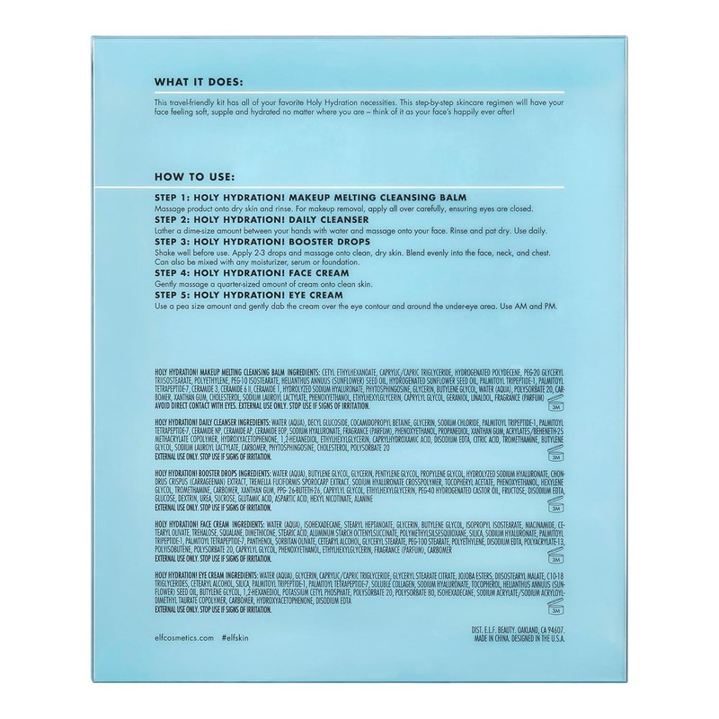 e.l.f. SKIN Holy Hydration Mini Kit — A complete hydration set with Daily Cleanser, Makeup Melting Cleansing Balm, Hydrating Booster Drops, Face Cream, and Eye Cream. Infused with hyaluronic acid, ceramides, and peptides to hydrate, plump, and strengthen skin. Travel-friendly, vegan, and cruelty-free for soft, refreshed skin anytime, anywhere.