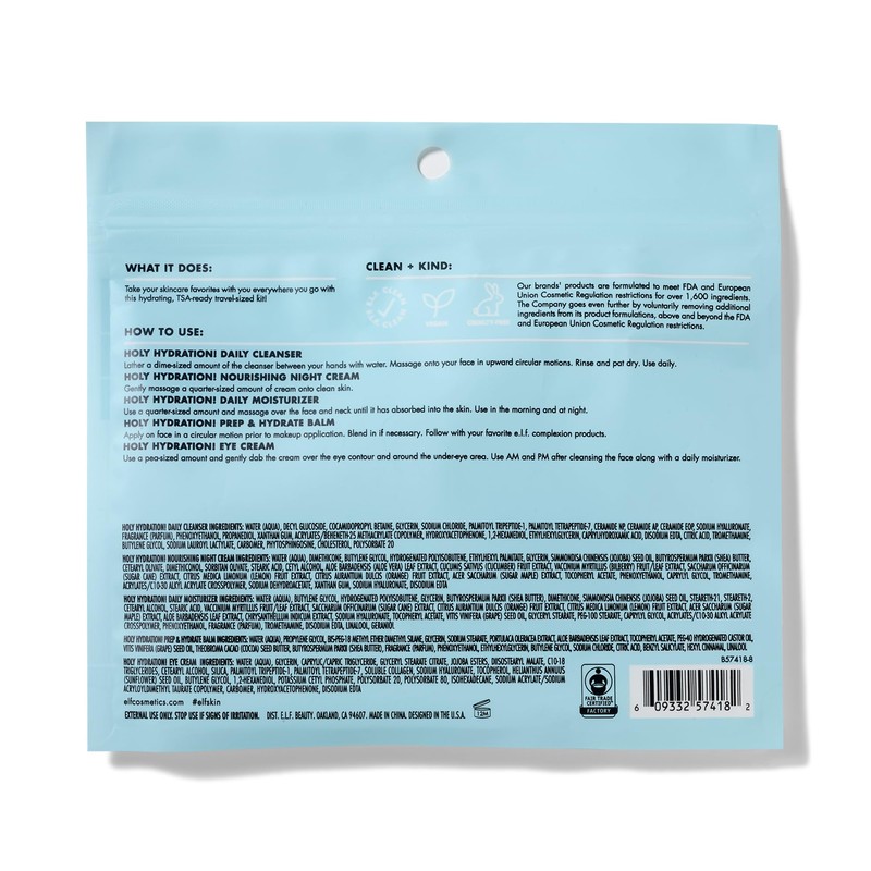 What it is: Five hydrating skincare favorites packed in one travel-sized kit. Why we love: A complete skincare routine in one kit TSA-friendly sizes Moisturizing, vitamin-infused formulas Key Ingredients: Citric Acid - Gently exfoliates and evens skin tone Cucumber Extract - Calms skin and reduces puffiness Shea Butter - Nourishes and softens skin Aloe Vera - Soothes and provides anti-inflammatory benefits Jojoba Oil - Locks in moisture Vitamin E - Brings a refreshing moisture boost A skincare routine that’s ready to go where you are! This convenient travel-sized kit includes five moisturizing skincare faves that will deeply nourish, brighten, and soothe all skin types. Each product packs a punch and is infused with skin-quenching ingredients that will hydrate your skin from the inside out. Kit includes: Daily Face Cleanser (30ml) - A gentle daily cleanser infused with Citric Acid that removes dirt, impurities, and makeup while brightening skin. Prep and Hydrate Balm (6g) - A water-based balm stick that instantly hydrates, improves skin texture, and preps skin for makeup application. Daily Hydration Moisturizer (25 ml) - A lightweight cream moisturizer infused with essential nutrients to deeply nourish the skin. Nourishing Night Cream (15g) - A soothing and calming cream that revitalizes the skin overnight. Illuminating Eye Cream (7g) - A rich and nourishing eye cream that reawakens your delicate eye area. All e.l.f. products are made from skin-loving ingredients you want, minus the toxins you don’t—all at good-for-you prices. All e.l.f. products are 100% vegan, cruelty-free, and leaping bunny certified. Because kindness is chic. "