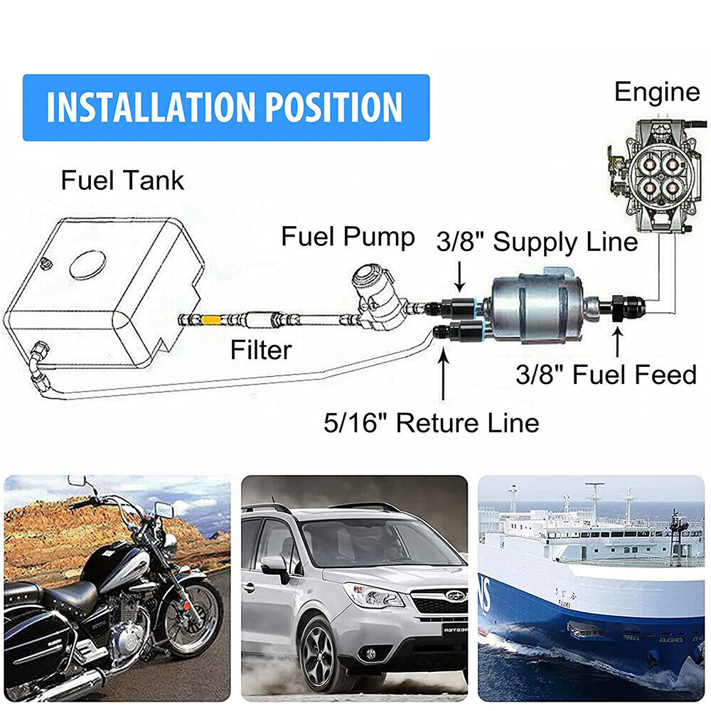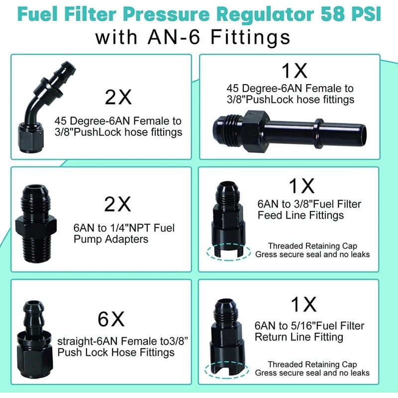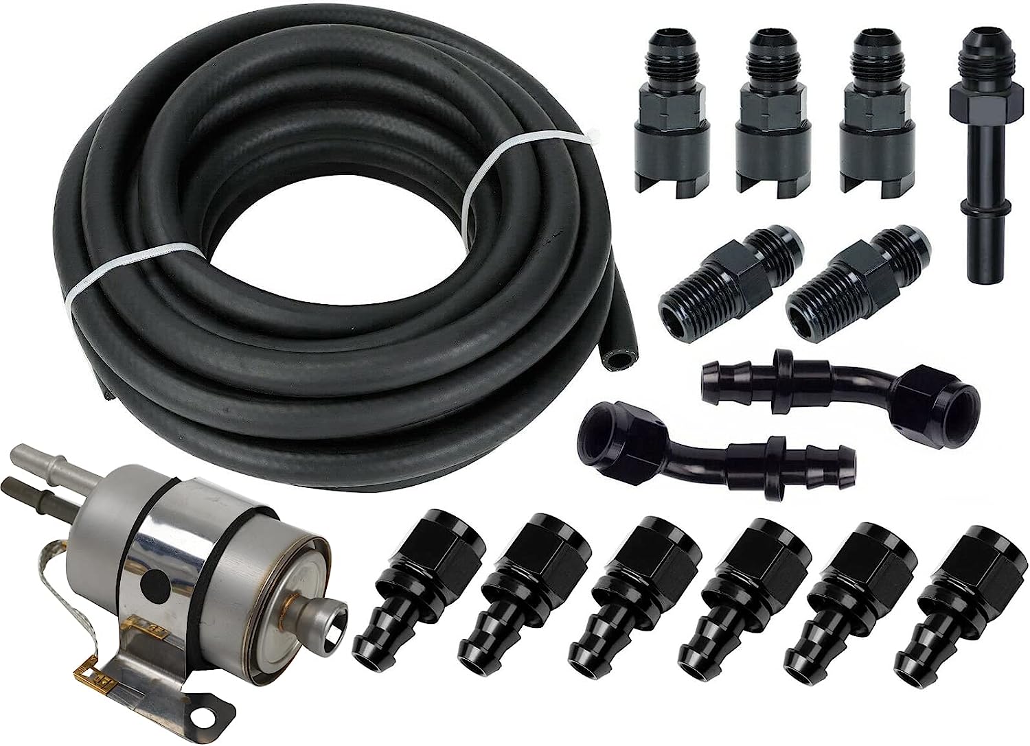 Package includes: 1Pc LS fuel filter/58psi regulator, 1Pc 6AN 25 feet of high-pressure fuel injection hose, 1Pc 6AN to 3/8" Male Straight Filter Fittings, 1Pc 6AN to 5/16" Fuel Filter Return Line Fitting, 2Pcs 6AN to 3/8" Fuel Filter Feed Line Fittings, 2Pcs -6AN to 1/4" NPT Fuel Pump Adapters, 2Pcs 45 Degree -6AN Female to 3/8" Push Lock hose fittings, 6Pcs straight -6AN Female to 3/8" Push Lock hose fittings