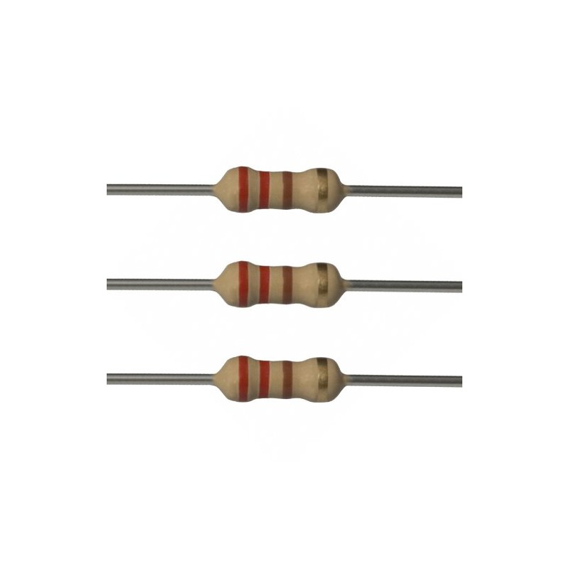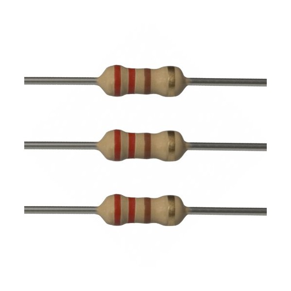 100 each 220 ohm resistors. 1/4 watt. 5% tolerance. Flame retardant coating. Lead free & RoHS Compliant. Cut tape packaging.
