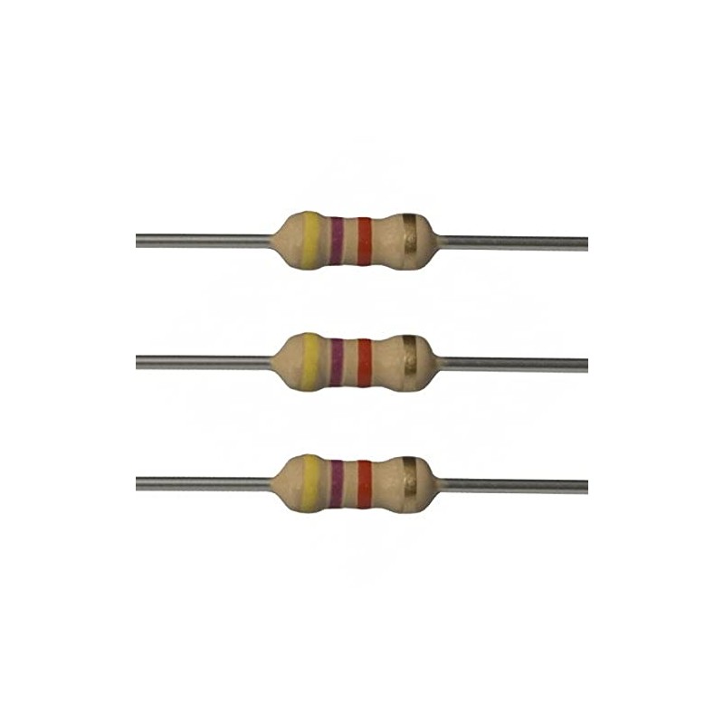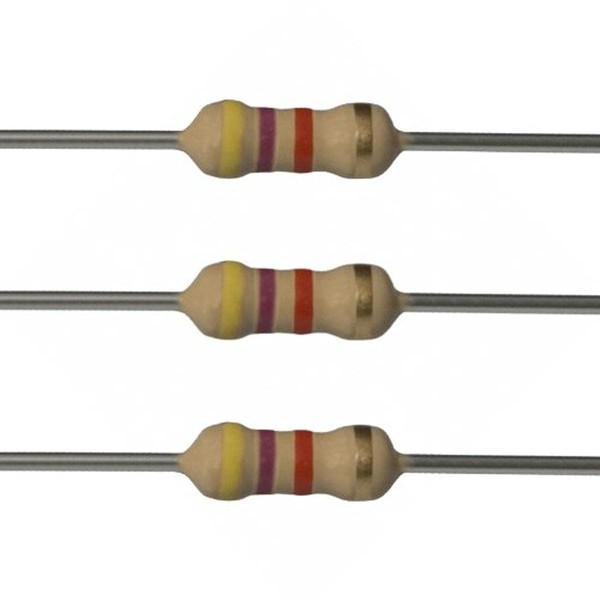 25 each 4.7k ohm resistors. 1/4 watt. 5% tolerance. Flame retardant coating. Lead free & RoHS Compliant. Cut tape packaging.
