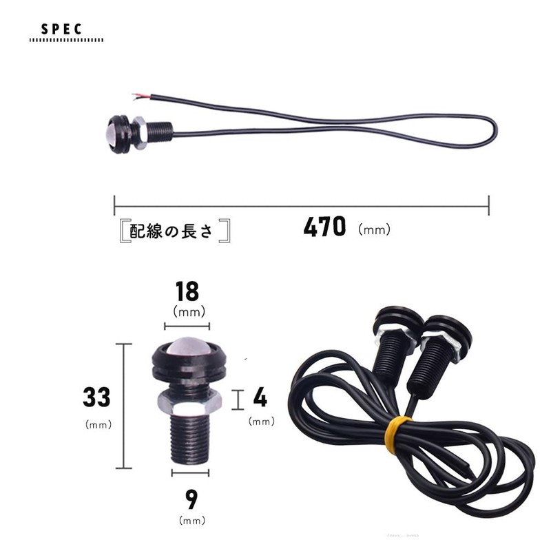 - Power Supply Voltage: 12 V (9 W); Current Consumption: 0.08 A; Wire Length: Approx. 18.5 inches (47 cm); Body Material: Aluminum; Mounting Type: Bolt fixed; Waterproof; LED: COB High Power Chip; Color Temperature: 6,500K