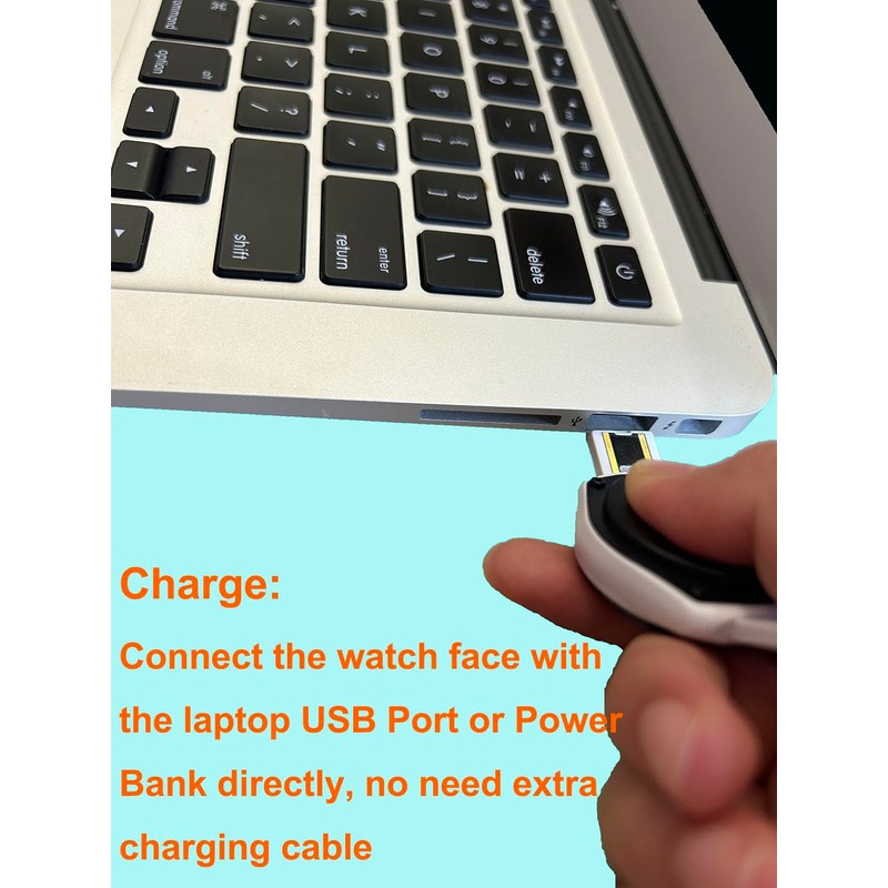 Remove the watch from the rubber case and connect the “Male” USB-A connector on the watch to a USB-A port directly, no need extra charging cable, one full charge can last up to 8-40 days.