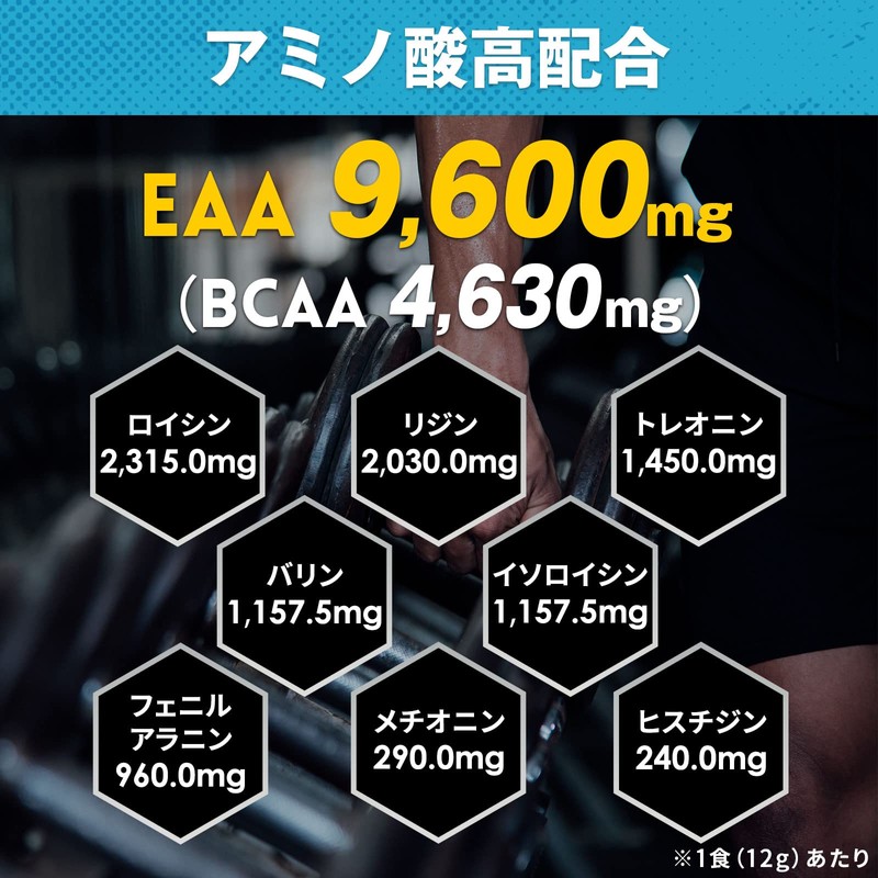 - 【圧倒的な栄養価】L-ロイシン 2,315.0mg/L-リジン塩酸塩 2,030.0mg/トレオニン(スレオニン) 1,450.0mg/L-バリン 1,157.5mg/L-イソロイシン 1,157.5mg/L-フェニルアラニン 960.0mg/L-メチオニン 290.0mg/L-ヒスチジン 240.0mg/ベータアラニン 1200.0mg/マルトデキストリン/クエン酸 *1食あたり