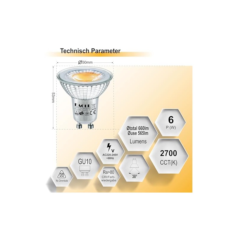 - 1. Praktische Funktionen: Warme, Komfortable, helle LED-Richtungslampe, sehr geringer lichtverlust, 660 Lumen 2700K Warmwei? licht, Hohe Helligkeit, Stabiles licht, Kein Hochfrequenz Strobe, Nicht dimmbar. Nur fr normale Schalter geeignet, Sofort ein, sofortige volle Helligkeit, keine Verz?gerung, Kein flimmern, kein L?rm, kein Geruch, kein Quecksilbergehalt