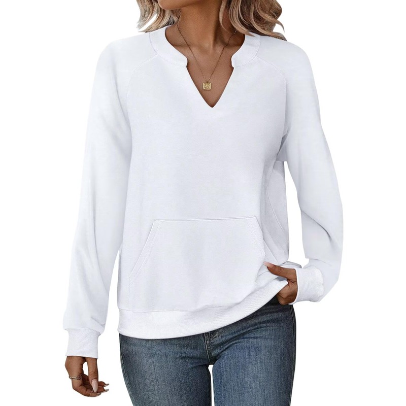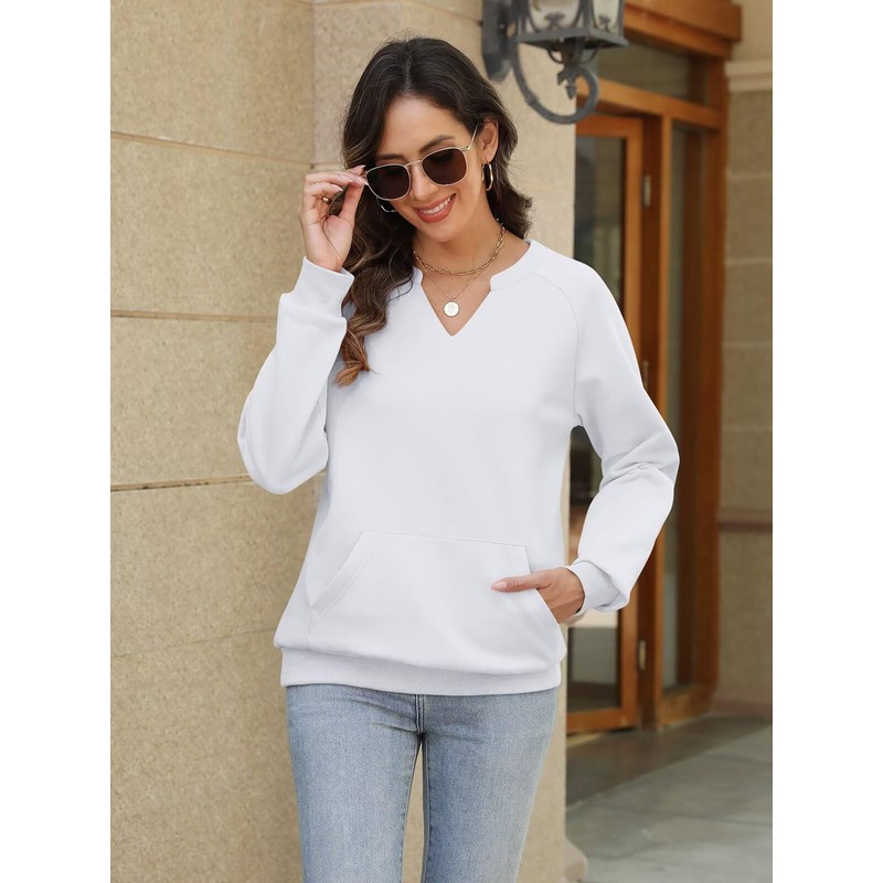 EADINVE Womens V Neck Sweatshirts with Pockets Fleece Pullover Casual Loose Fit Long Sleeve Tops Fall Clothes 2025 White