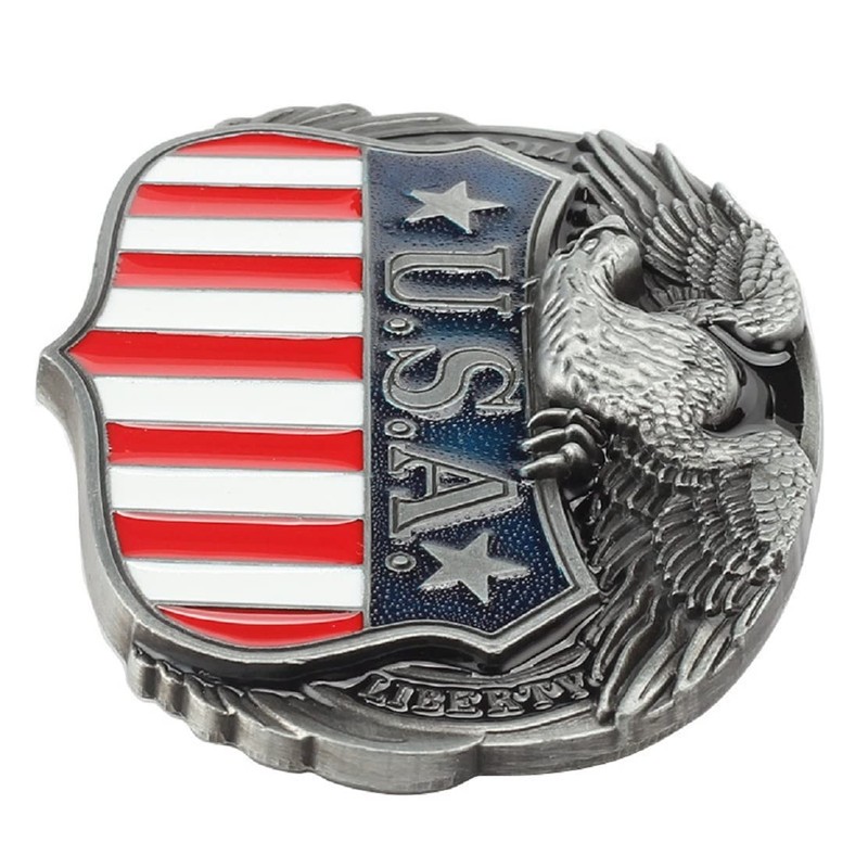 - 【Excellent quality】- American flag shield belt buckle is made of highly polished zinc alloy through metal plating process. It’s fade-resistant, wear-resistant, comfortable to wear and not easy to break. And it is longer lasting for daily wear and can still maintain its color and luster in the next few years. The well-designed curved edge also brings a delicate touch to the flying hawk shield belt buckle.