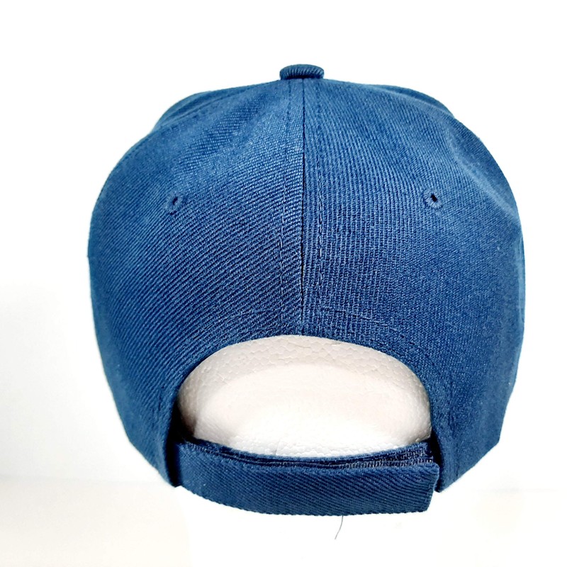 High Quality Embroidered Patch Heat Pressed Onto A 6 Panel Navy Blue Hat Made of 100% Acrylic
