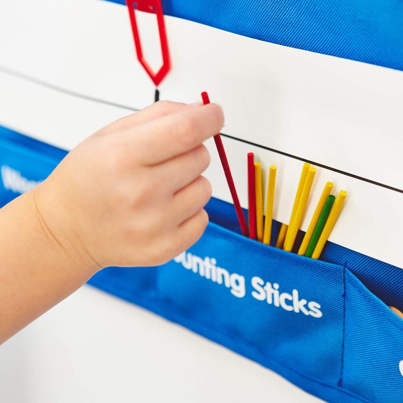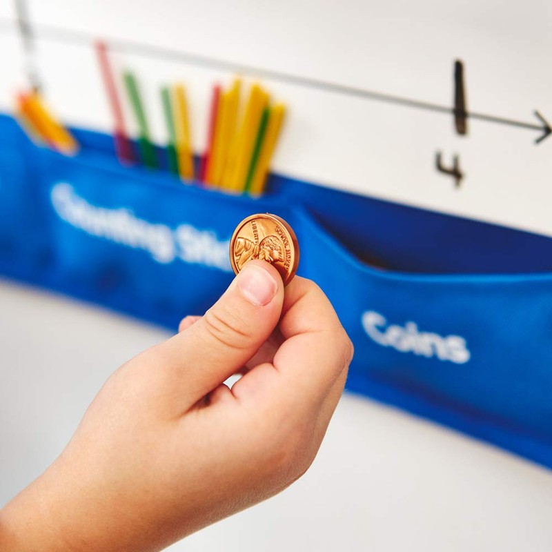 - Each day, engage students by updating the daily weather and temperature. Use the counting sticks and place value pockets to track the number of days you have been in school, and use the coins to represent that same value in money. The number line and part-part-whole dry erase surfaces can be utilized to show the day of the week, the progress of the month, or any other value you wish to customize!