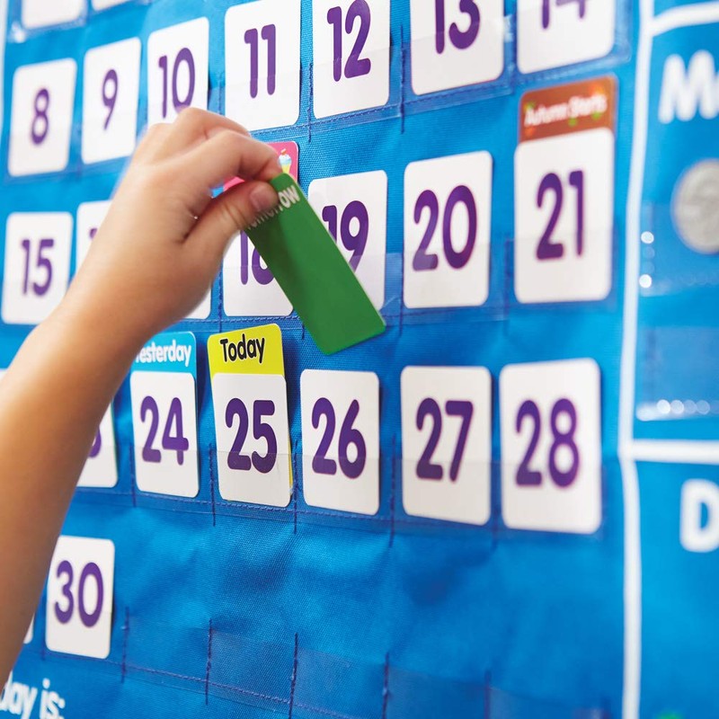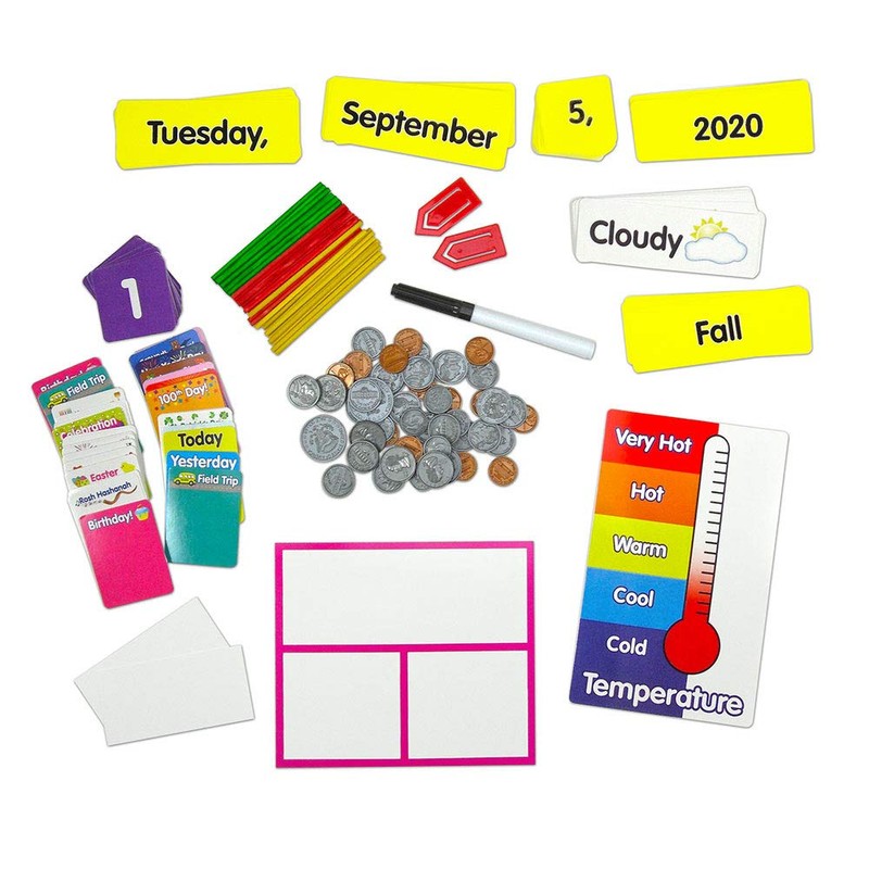 - Measures 35" x 35". Includes: pocket chart, 6 double-sided months of the year cards, 33 double-sided days of the month carts, 56 special day and holiday cards (includes 4 blanks for customization), 55 day/month/year cards, 11 season/weather cards, 55 plastic coins, 30 wooden counting sticks, temperature chart, dry-erase number line, dry-erase part-part-whole board, 1 dry-erase marker and 2 plastic arrow clips.