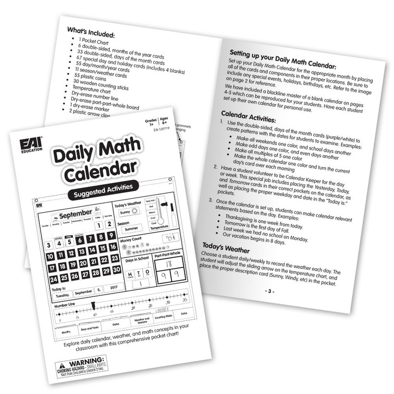 - The chart also has labeled storage pockets for easy organization, four metal grommets for hanging, and a teacher guide with suggested activities using your Daily Math Calendar Pocket Chart.