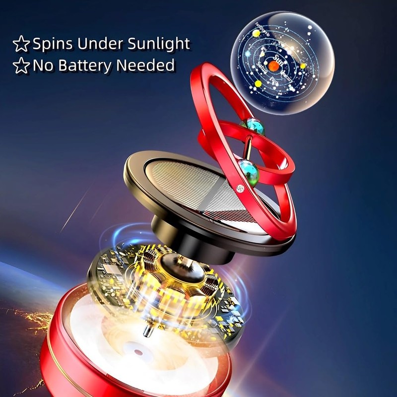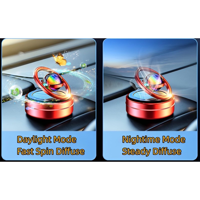 Searching for the perfect Car/Home/Office decoration, or ultimate holiday gift for stocking stuffers? Look no further. This elegant accessory not only adds a touch of sophistication to your vehicle but also enhances your driving experience. Powered by sunlight, this rotating ornament requires no batteries, making it an environmentally conscious choice. As it gently spins, it diffuses a delightful aroma of your choice, transforming your car into a soothing oasis on wheels. With a variety of colors to choose from—Black, Red, Silver, Gold, and Pink—our Car Ornament is more than just a decorative piece. It also doubles as an air freshener, ensuring your car smells as good as it looks. Designed to relieve stress during commutes or road trips, our Solar-Powered Car Ornament creates a calming atmosphere, making your journeys more enjoyable. Elevate your car's interior and your holiday gifting with our Solar-Powered Car Ornament today! ***How to Use***: Alighn middle hole of the base, insert the top cover. Make sure to PRESS after alignement! The rotation will need proper alignment of base and top cover + straight sunlight (Better result btw 9AM - 4PM))