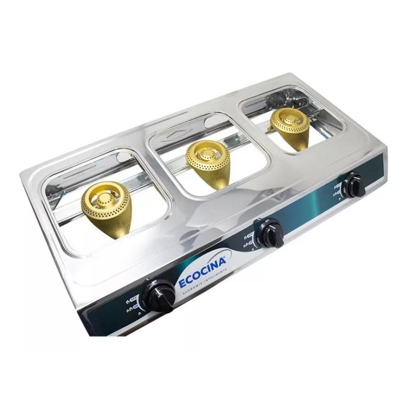 Estufa de acero inoxidable con chisperos, con 3 quemadores, ideal para cocinas de poco espacio, con gran potencia para calentar. Se recomienda que lo utilicen personas que cuentan con una cocina pequeña y desean calentar cantidades grandes de alimentos. Se puede poner todo tipo de ollas, por su tamaño y sus 3 quemadores es fácil de limpiar. Por su tamaño se puede transportar a cualquier lado que se desee.