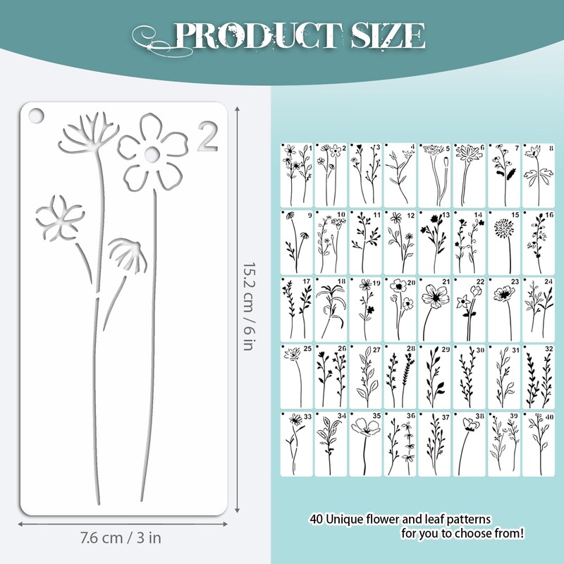 - 【40 Beautiful Designs】This painting stencils set includes 40 unique flower and leaf patterns, each measures 3x6 inches, you'll have plenty of options to create beautiful crafts and home decorations.
