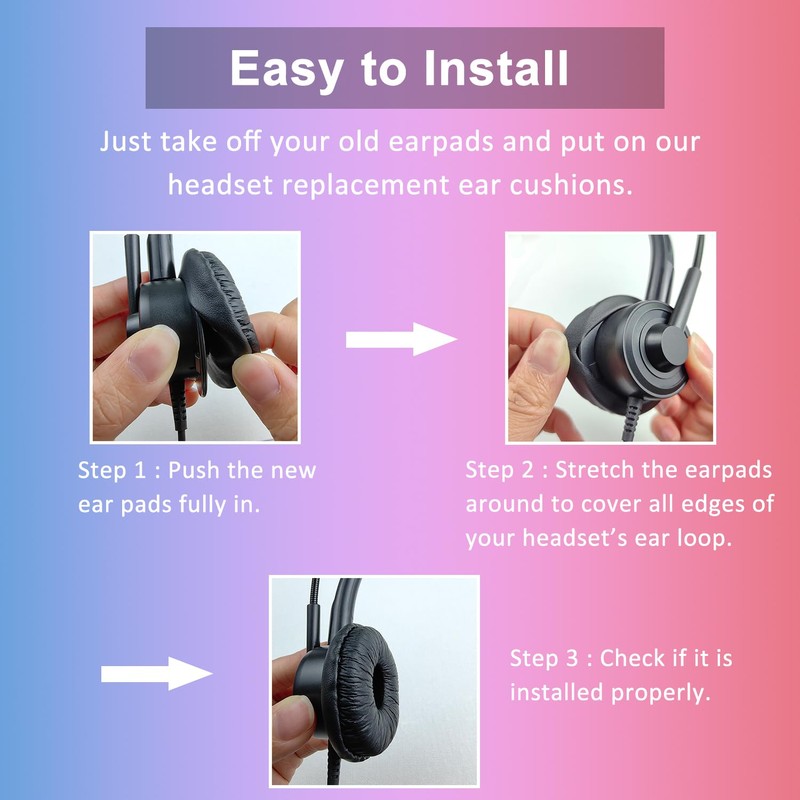 - 【Easy to Install and Comfortable】 Take off the old ear cushions and put on the new ear pads, update unhygienic, worn or unusable ear pads. No tools needed, just a few seconds to have the perfect new headset. Soft & High-quality Breathable Leatherette offer optimal comfort during extended wear, and the leatherette's dimensions ensure precise fitting.