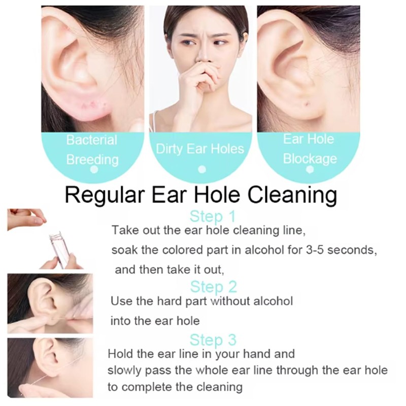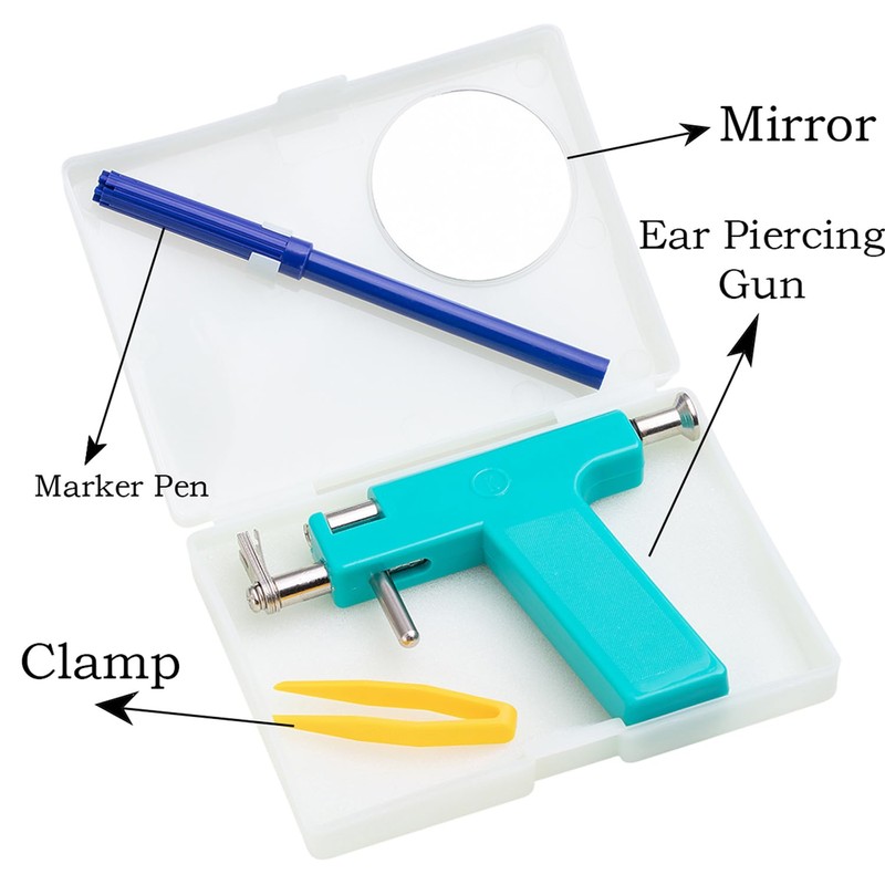 - 【Complete Set】 This ear piercing kit includes everything you need for professional-quality ear piercing at home and salon,60 Ear piercing cleaning line,24 Silver White Crystal studs,6 Disposable waterproof ear muffs,5 Alcohol swab,5 Iodophor cotton swabs,1 pro ear piercing gun, 1 mark pen, 1 Mirror,1 clamp,A pack of colored ear sticks