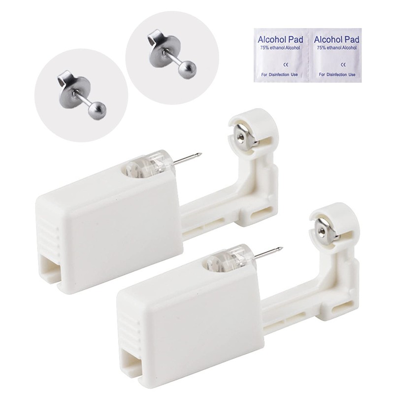 - 2 disposable ear piercing guns, 2 earring studs, and 2 alcohol pads.