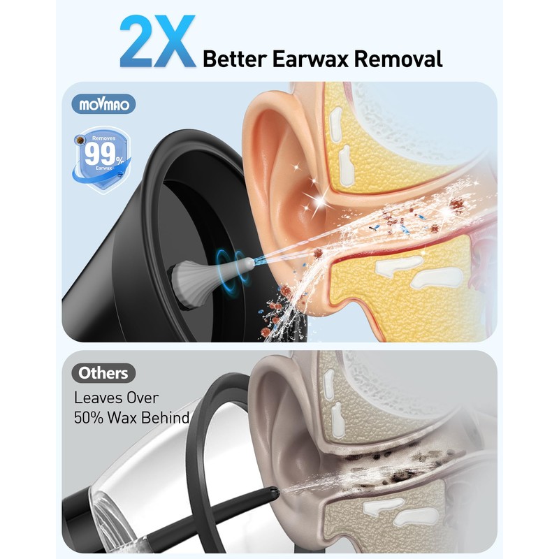 - Superior Ear Wax Removal Kit – MOVMAO's 2025 upgraded ear irrigation flushing system delivers twice the cleaning power of other ear washers, removing up to 99.99% of stubborn earwax for a thorough and effective clean. Equipped with the latest-generation smart chip, this ear cleaner intelligently controls the water flow for gentle, non-irritating rinse that protects the ear canal.