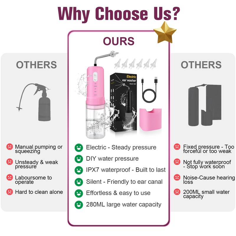 • Safe design:The karidi ear cleaning tool includes six reusable replacement suction heads, and each earbud is made from a soft and stretchy food-grade silicone material that won't harm your ears,The 4-well water sprayer cleans from the edge of the ear, so you don't have to worry about the direct spray of water causing damage to your ear. Into the ear canal, hitting the eardrum
