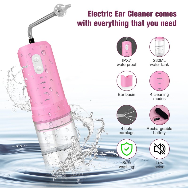 Ear Wax Removal, Electric Ear Irrigation Flushing System, Water Powered Ear Cleaner with 4 Pressure Modes, 6 Reusable Replacement Tips, Safe and Effective Ear Cleaning Tool for Adults (Pink)
