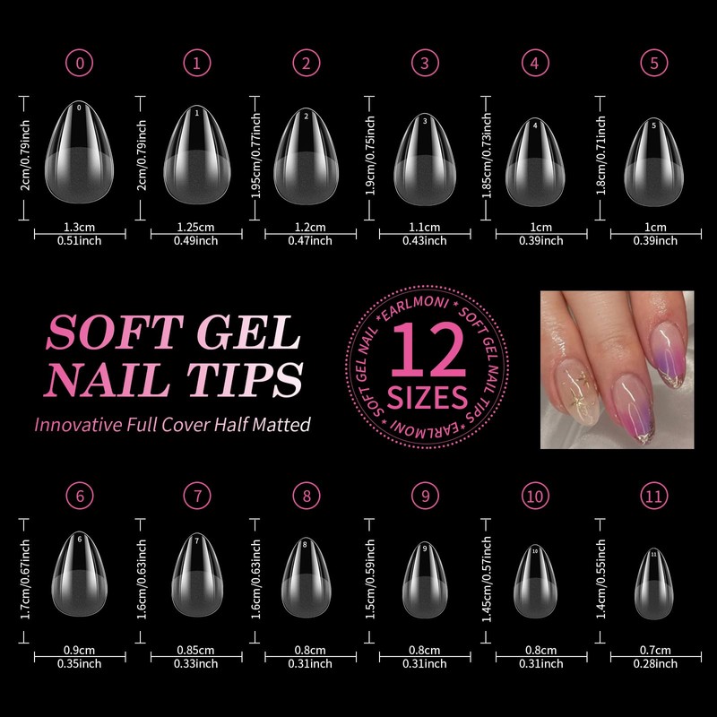 - DIY short almond nail tips: EARLMONI short almond nail tips fit perfectly with your natural nails. Soft gel tips can be used with nail glue, crystal powder, polka dot powder, etc. These gel tips can help you easily create many popular classic nail styles in your daily life