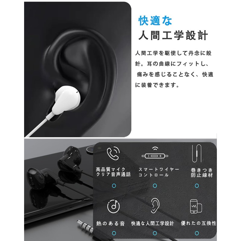 - Comfortable Design & Excellent Durability: The ergonomic design is based on the shape of the ears, so there is no need to worry about it falling off when you put it on, so you can enjoy music from your iPhone or smartphone, and it is suitable for a variety of activities such as commuting, the gym, running, jogging, etc. Our wired and high quality sound quality is made of soft, high elasticity TPE (thermoplastic elastomer) with copper wires + fiber inside, and the terminals of wired earbuds are reinforced with SR tube, which improves durability and prevents disconnection, and is difficult to disconnect even when pulled, and is quite durable. Laboratory tested for more than 10,000 times and undergoes a rigorous bending test, ensuring quality assurance, durable and long lasting. It is also abrasion resistant and stain resistant