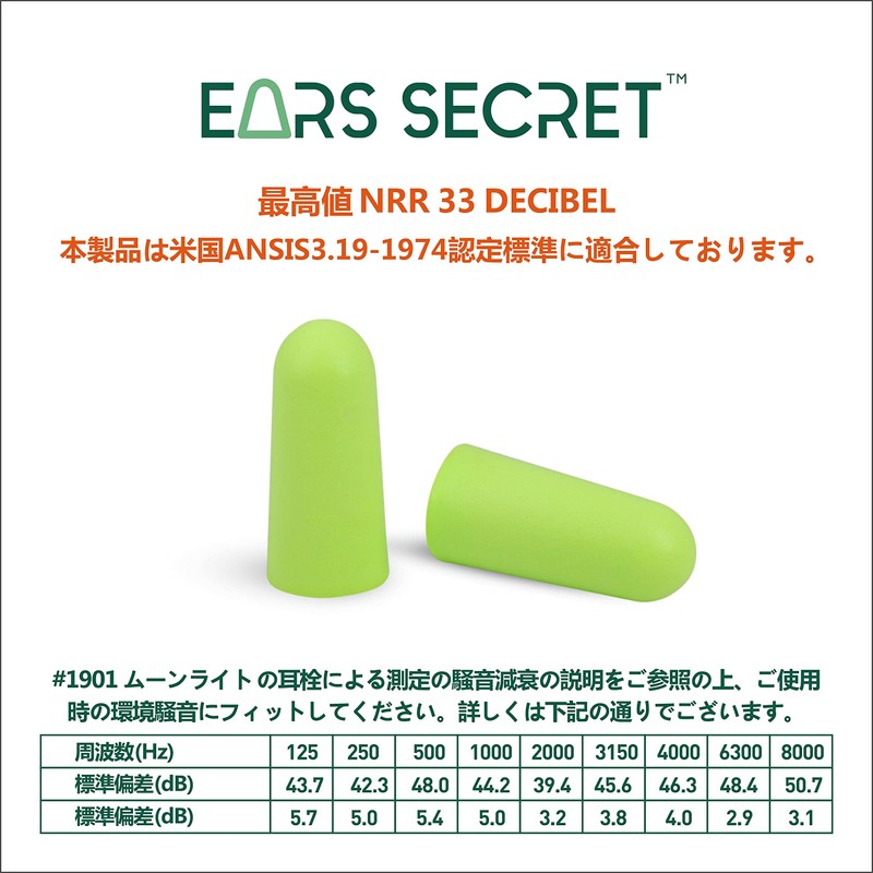 - 【3ペアのトライアル付き】EARS SECRET Moonlight はレギュラーサイズの耳栓で、睡眠用におすすめです。さまざまなサイズの外耳道に合わせるために、EARS SECRETは大きめから小さめまで3形状の耳栓をトライアルで用意しており、100ペア+3形状のトライアルパックとなっています