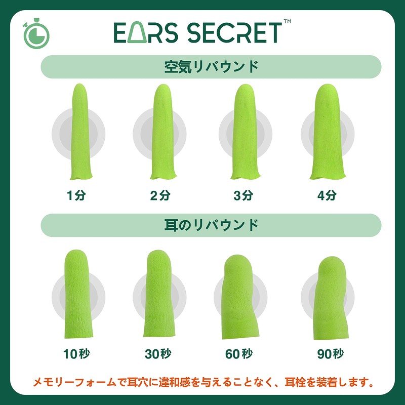 - 【適度な復元力】優れた品質とPUフォームの仕上がりのおかげで、EARS SECRET耳栓は、直径0.5〜0.7mmのシリンダーに圧縮でき、1〜2分以上形状を保持し、約1分で耳の中で完全に拡張します(時間は温度と湿度によって異なります)。優れた復元力で幅広い耳のサイズにフィットできます