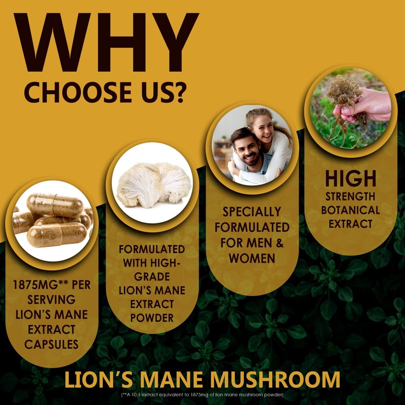 - SUPERIOR QUALITY FORMULATION AND OUTSTANDING VALUE: Each Lion’s Mane mushroom capsule is made from high quality ingredients serving contains 1875 mg per capsule and 120 capsules per bottle-Value for Money! We just believe in the need for high -quality supplements demand for today. Compared to other leading brands we focus only on quality rather than quantity.