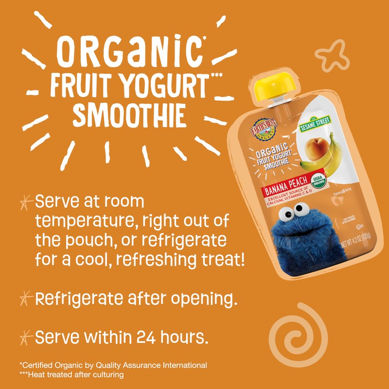 - Twelve 4.2 oz. pouches of Earth's Best Organic Sesame Street Toddler Fruit Yogurt Smoothie, Peach Banana
